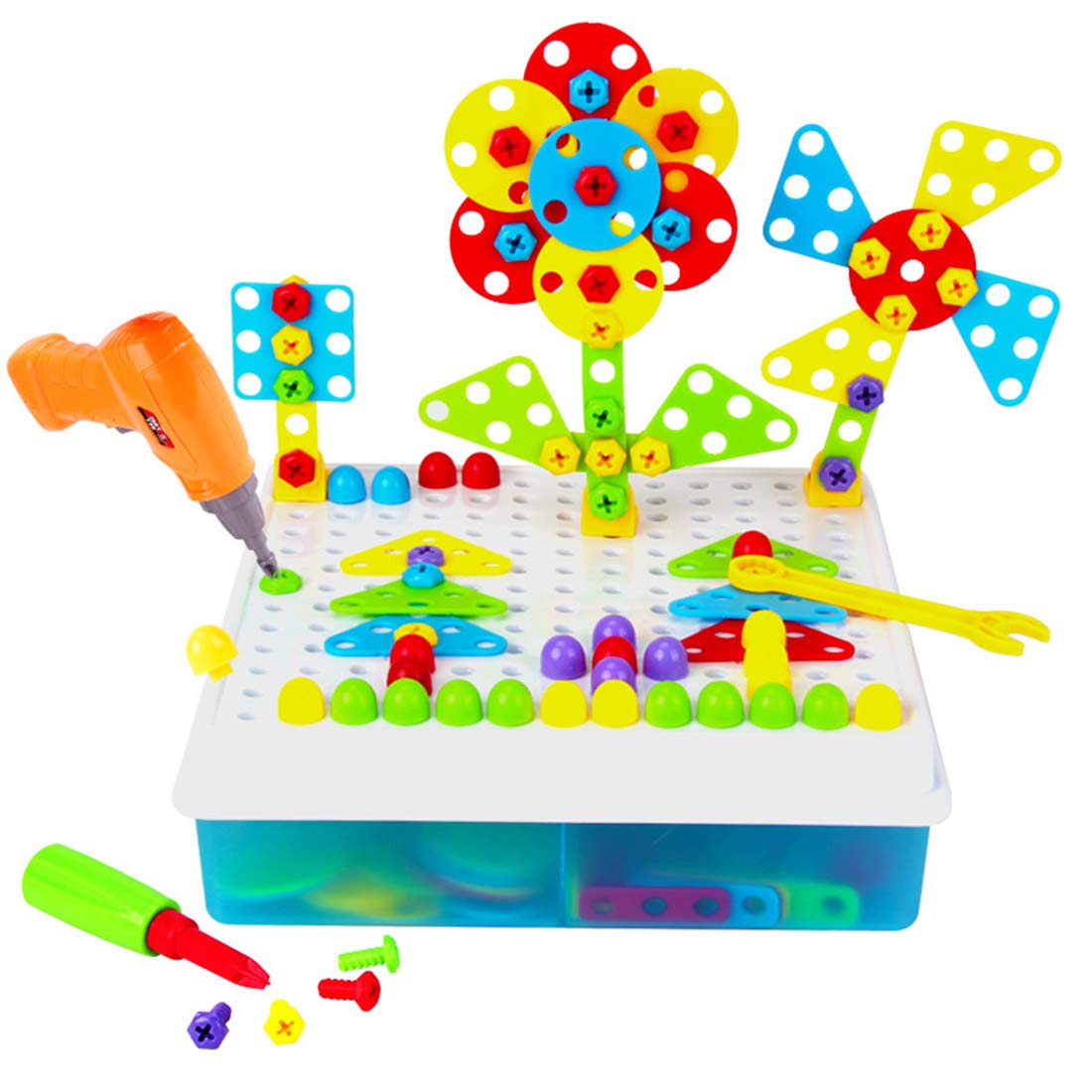 A caballo entre juego de construcción, pinchitos para hacer mosaicos y caja de herramientas, tenéis este juego muy completo y a buen precio.
